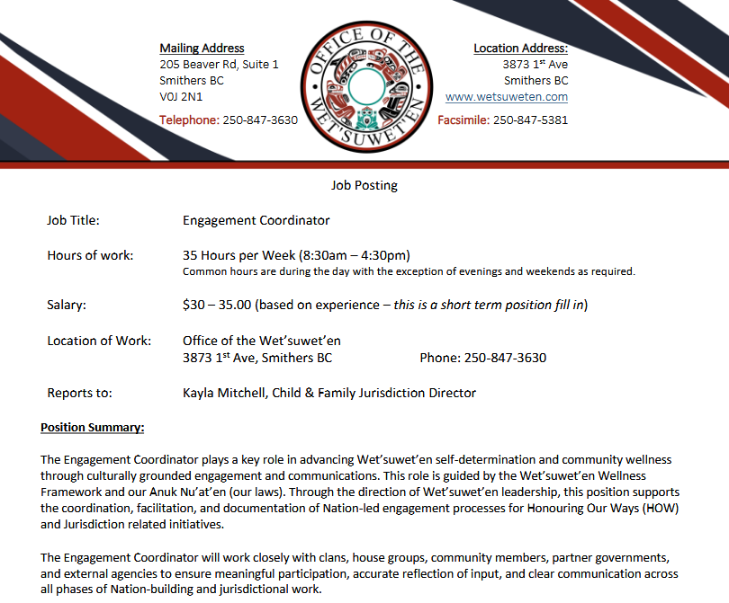 The Office of the Wet'suwet'en's Child & Family Jurisdiction Team is hiring an Engagement Coordinator.