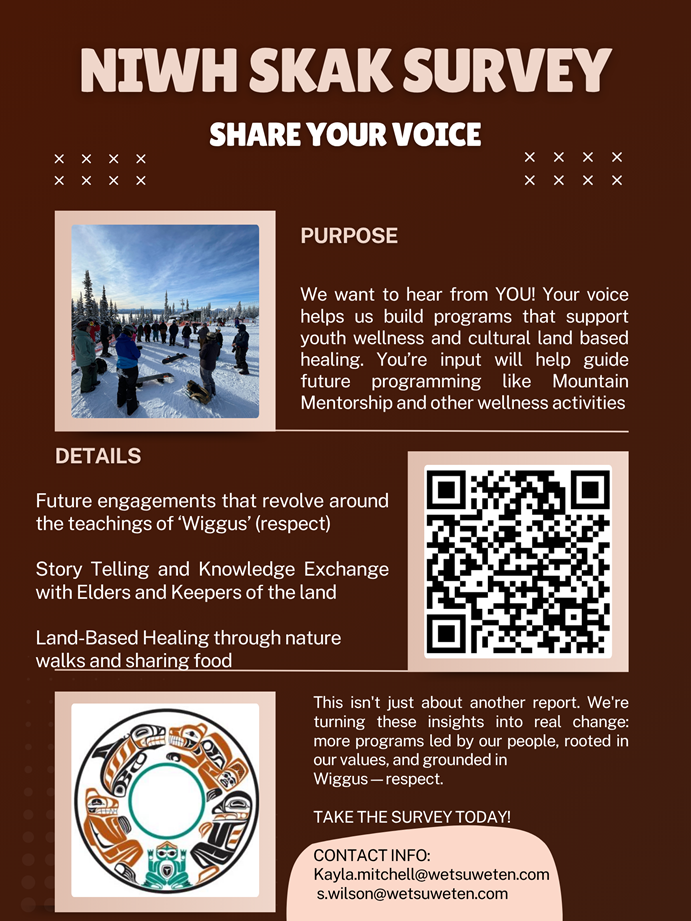 Please share this survey widely with Wet’suwet’en youth in your community, classrooms, homes, and circles. Every voice matters, and this is a step toward building programming that reflects the dreams, needs, and strengths of Wet’suwet’en young people.